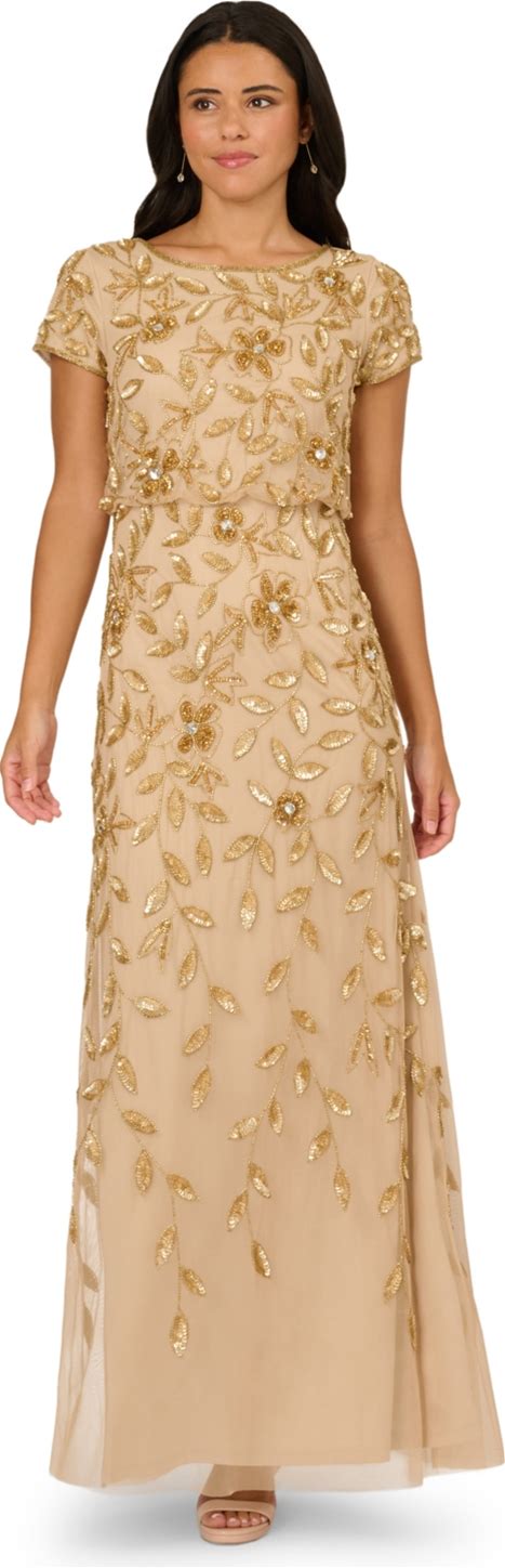 Adrianna Papell Women's Boat-Neck Blouson Beaded Gown - Champagne Gold - Size 14