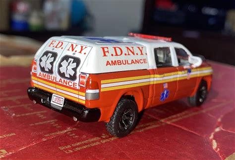 Kitbash 1 Of 1 Custom Made Rescue Ambulance Fire Department New York Fdny 1/64. Autoworld Kitbash. Red And White. Contemporary Manufacture.